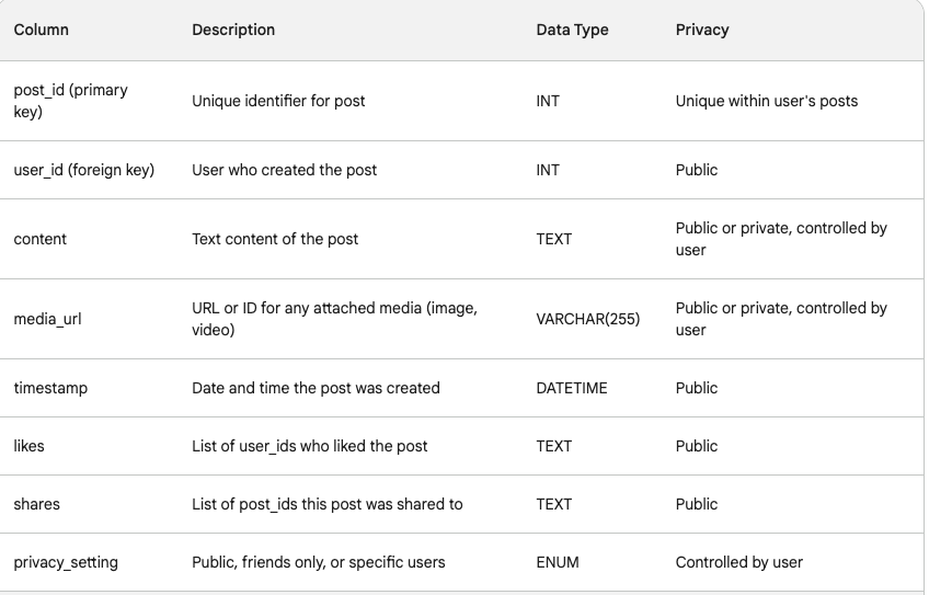 Sharding Approach: Shard table by user ID hash range to distribute user data evenly across multiple database servers. Shard table by a hash of the user ID to keep user posts co-located for faster read operations.Consider sharding other tables (e.g., Ads, Media) based on access patterns and data size.