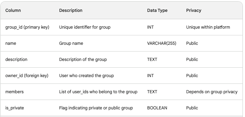 Group Management: Create and manage groups, group membership, and group discussions using dedicated database tables or graph structures.