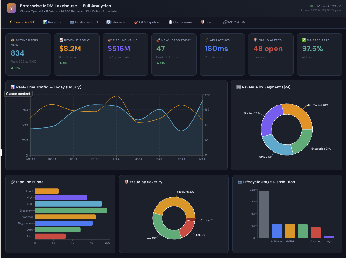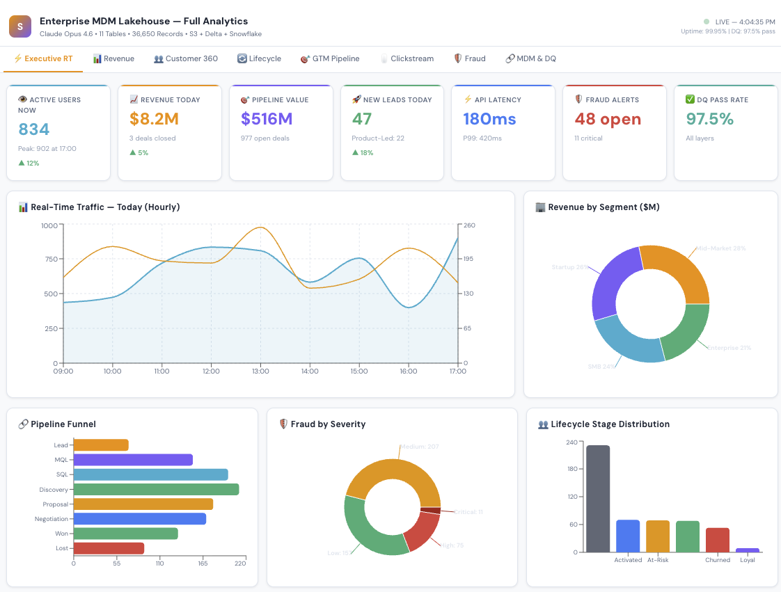 Executive Pulse — the "open your laptop Monday morning" view. Revenue today, active users right now, pipeline health, fraud alerts, system uptime. All at a glance.