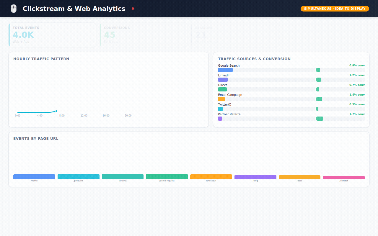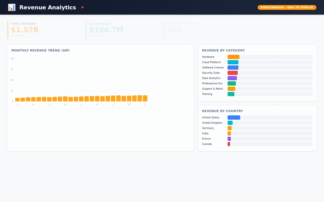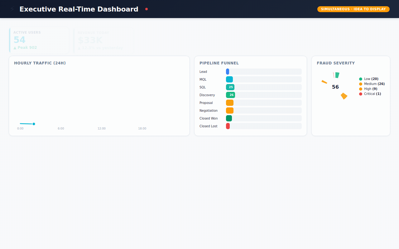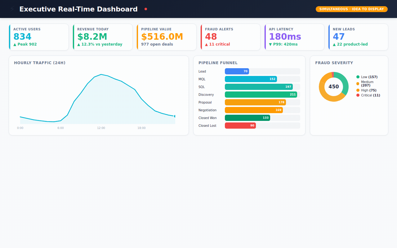 → 168 hours of real-time metrics — simulating what an executive dashboard would show: active users, API latency, revenue, system health, updated every hour