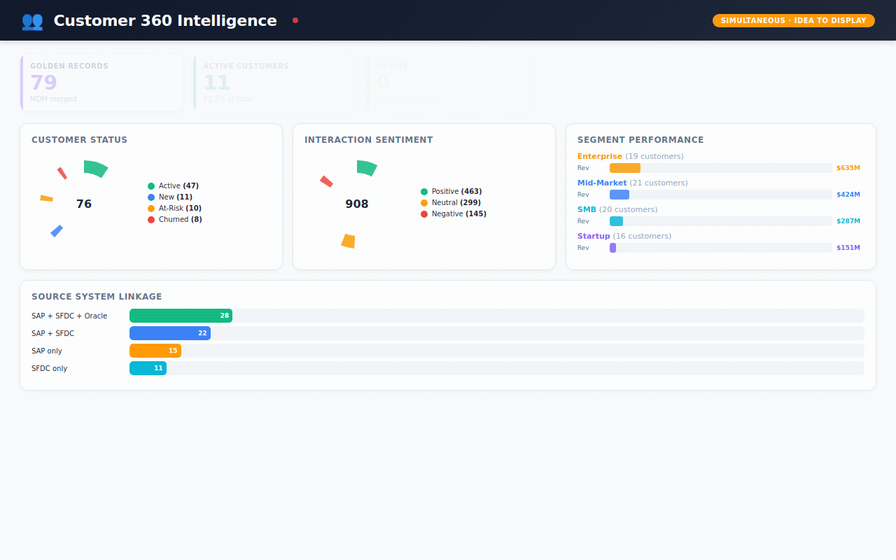 Customer 360 — the holy grail. One view per customer showing their status, segment, sentiment, lifetime value, and every interaction.