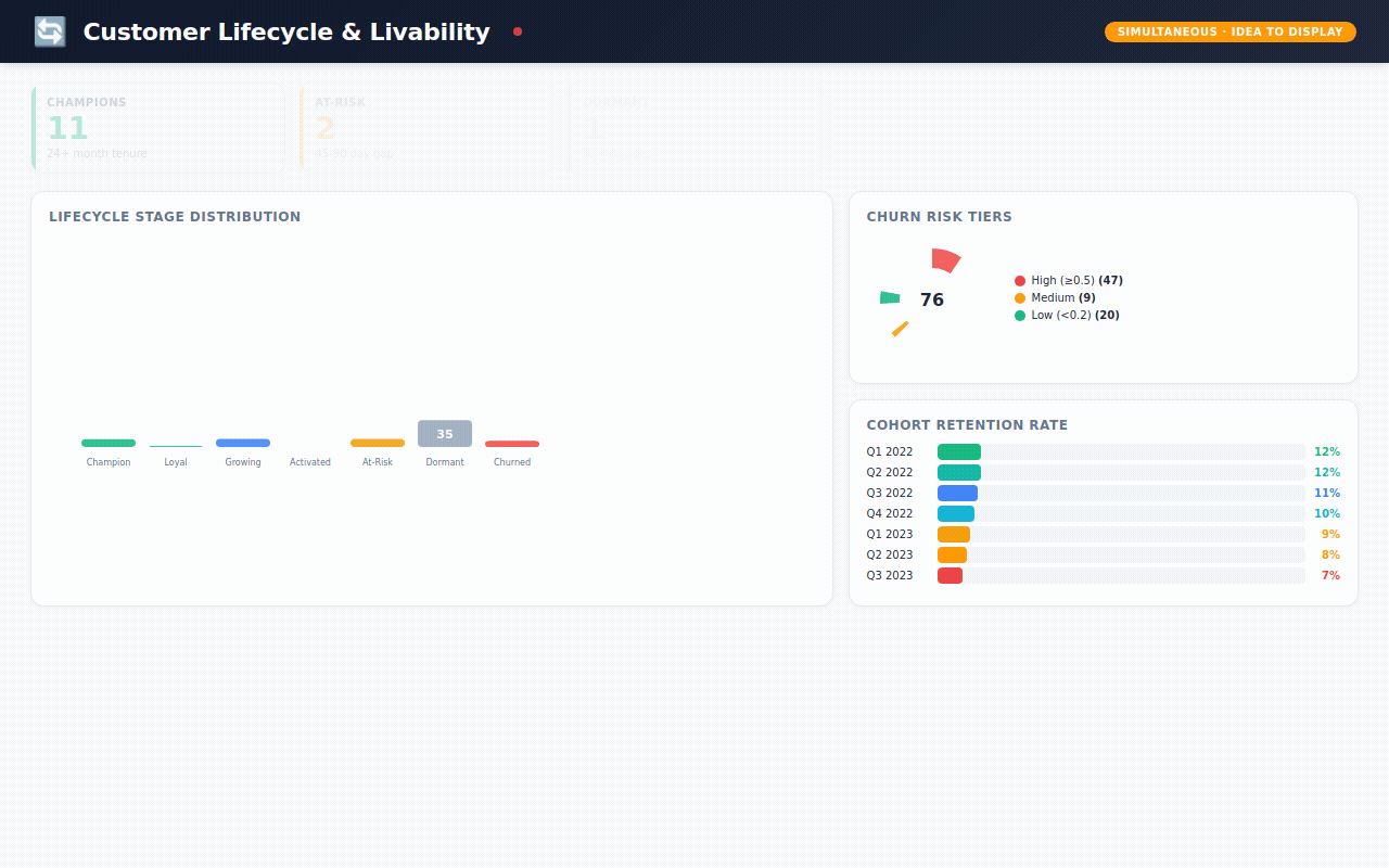 Customer Lifecycle — are customers thriving or fading? Champions vs. at-risk vs. churned. Churn risk scores. Health metrics. Recommended actions for each stage.
