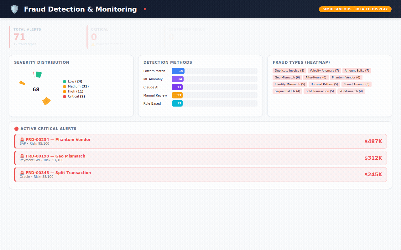 → 450 fraud alerts — flagged by 5 different detection methods (machine learning, AI analysis, pattern matching, rule engines, manual review) with severity scoring and investigation tracking