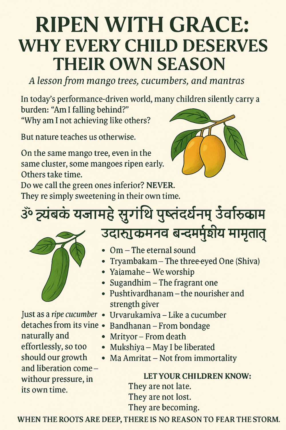💬 The symbolism is profound: Just as a cucumber (urvaruka) detaches from its vine naturally and effortlessly when it is ripe, may we — and our children — be freed from the binds of pressure, fear, and comparison when the time is right.