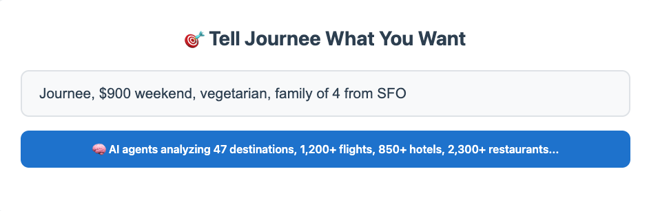 The Journee starts with travel because it's the perfect proving ground—complex, time-sensitive, highly personal, with countless variables. But the platform's true power emerges when you realize it can solve any multi-criteria optimization challenge where humans currently spend hours researching and comparing options.