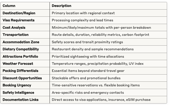 Temporal Accuracy: Price and visa information requires daily refresh cycles with source attribution and timestamp verification