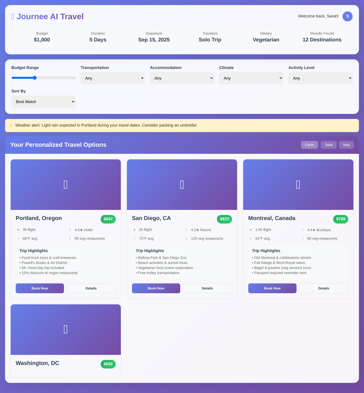 Results Grid: Multi-dimensional sorting capabilities (cost, visa complexity, weather risk, dietary compatibility, safety ratings)