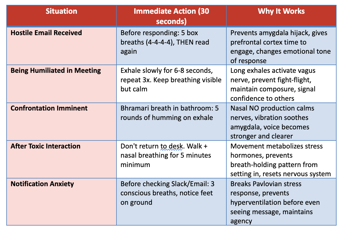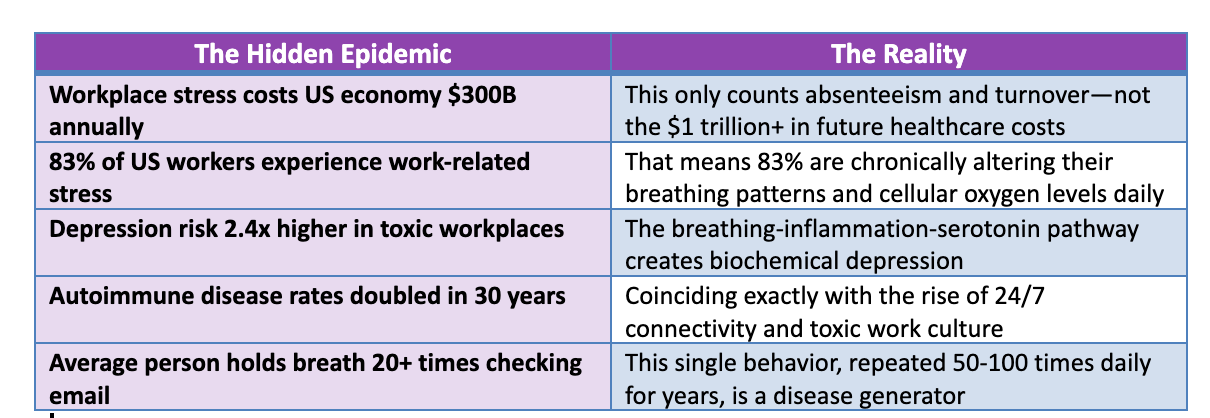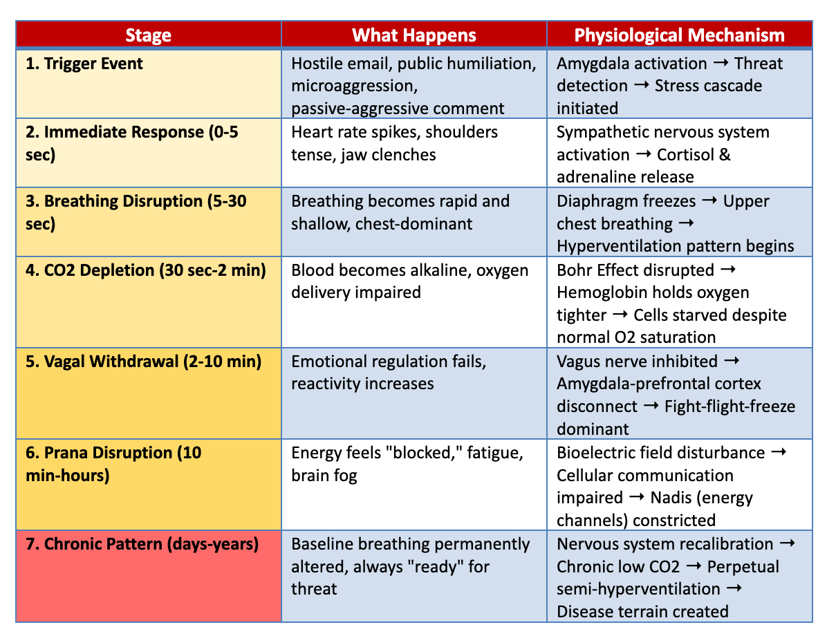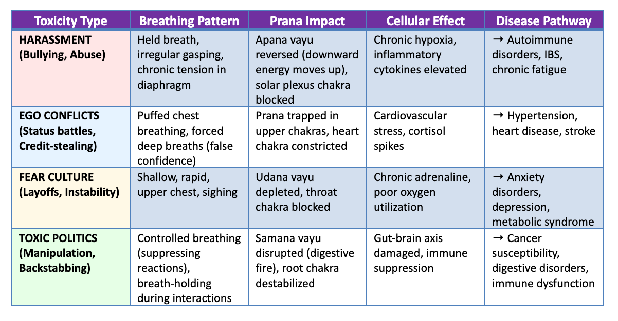 Workplace toxicity—harassment, ego battles, fear culture, toxic politics—isn't happening "out there" in some abstract space. It's happening in your amygdala, your vagus nerve, your diaphragm, your mitochondria. Every toxic interaction is a micro-injury to your breathing pattern. Every disrupted breathing pattern is a step toward disease.