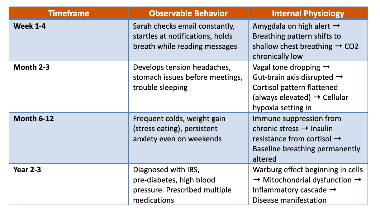 ⚠️ CRITICAL INSIGHT: The typical lag time between breathing pattern disruption and disease diagnosis is 3-15 years. This means the toxic job you had in your 30s manifests as cancer in your 40s. The harassment you endured at 25 becomes autoimmune disease at 35. Most people never connect the dots because the gap is too wide. But the body remembers. Every. Single. Breath.