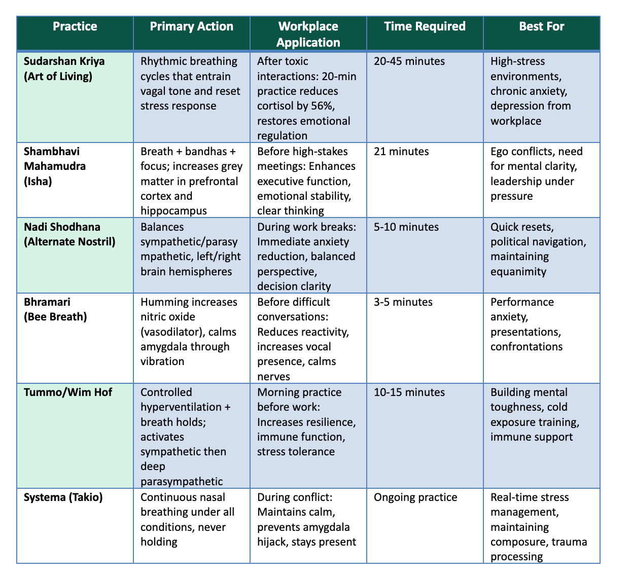 DISCLAIMER: This article is for educational purposes only and does not constitute medical advice. The practices described should be learned from qualified instructors. Individuals with respiratory, cardiovascular, or psychiatric conditions should consult healthcare providers before beginning any breathing practice. The connection between workplace stress and disease is supported by research, but individual outcomes vary. If you are experiencing severe workplace toxicity, seek support from HR professionals, legal counsel, mental health professionals, or career counselors as appropriate.
