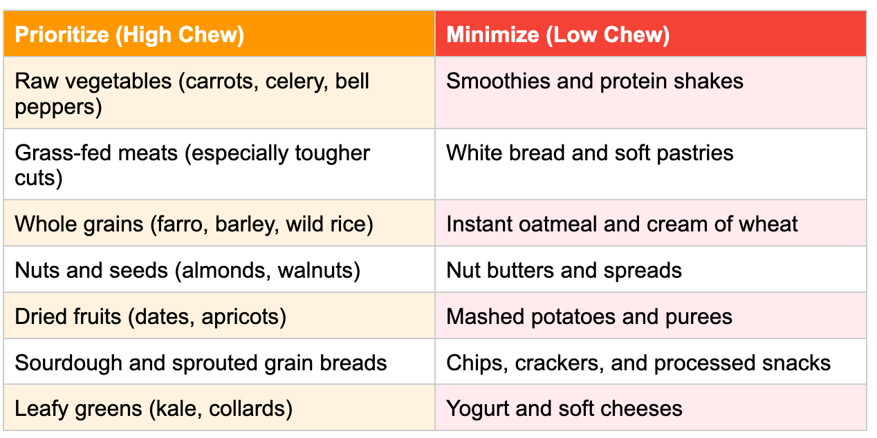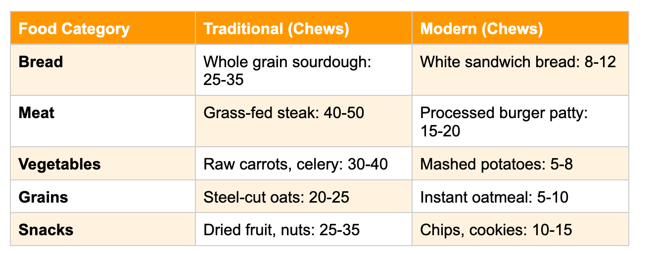 The Hidden Cost: Modern diets deliver 60-70% fewer chews per day than ancestral diets. This isn't just about missing jaw exercise—it's about consuming more calories faster, overwhelming digestive systems, and bypassing satiety signals.