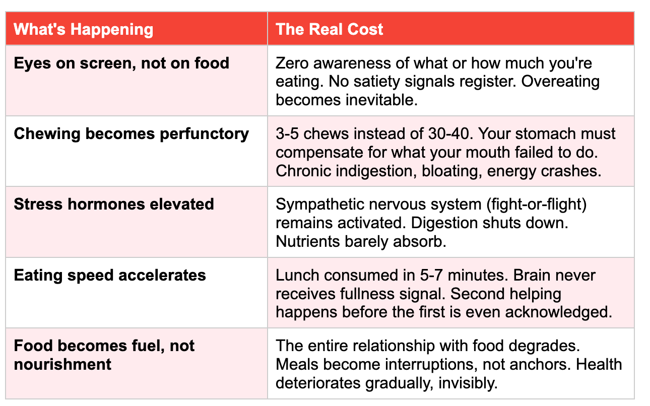 Food has become secondary. The device—the laptop, the phone, the endless notifications—takes primary focus. Conversations about work trump the conversation your body is trying to have with you about nourishment, satiety, and digestive readiness.