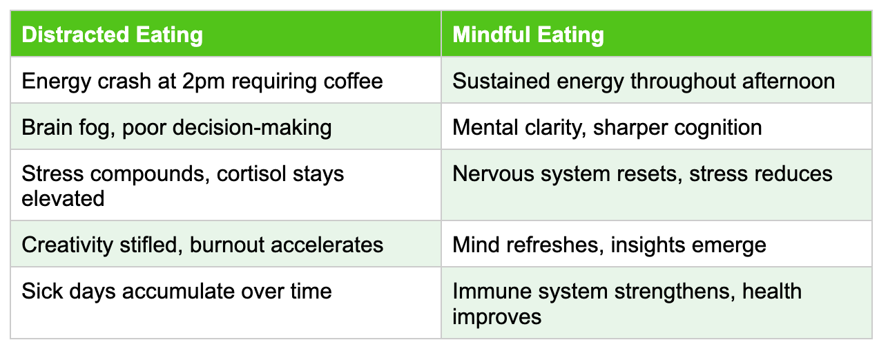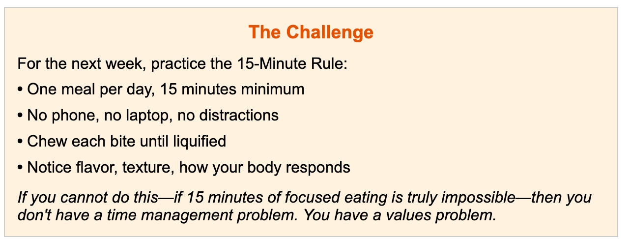 But here's the paradox: those 15 minutes of focused eating—no devices, no multitasking, just thorough chewing and mindful presence—will make you more productive, not less.
