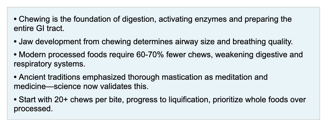 Ancient traditions from Ayurveda to Zen Buddhism emphasized thorough mastication. Modern science is catching up, revealing connections between chewing, jaw development, breathing patterns, and overall health that our ancestors intuitively understood. Meanwhile, industrial food has engineered the chew right out of our diets, with consequences we're only beginning to comprehend.