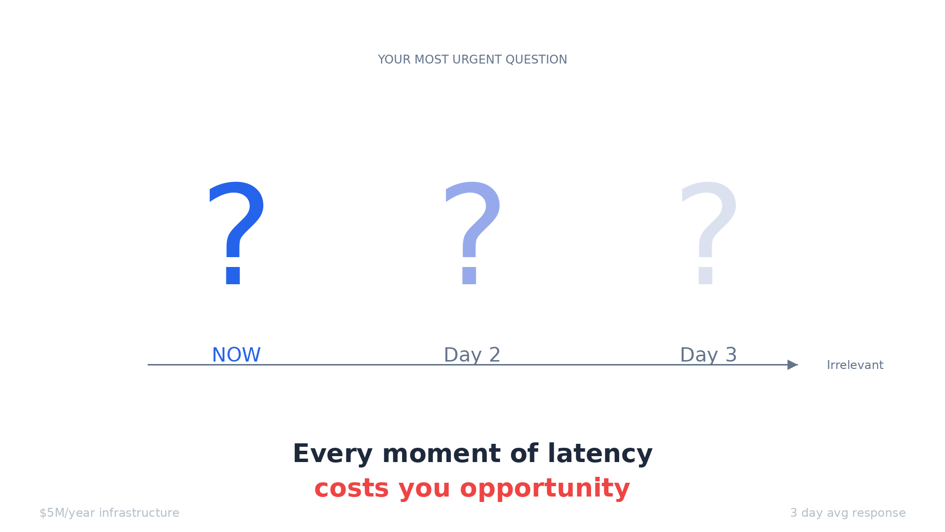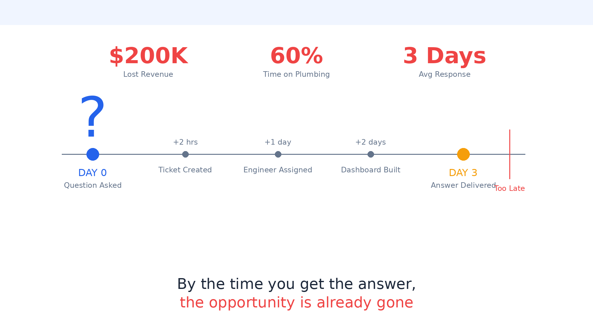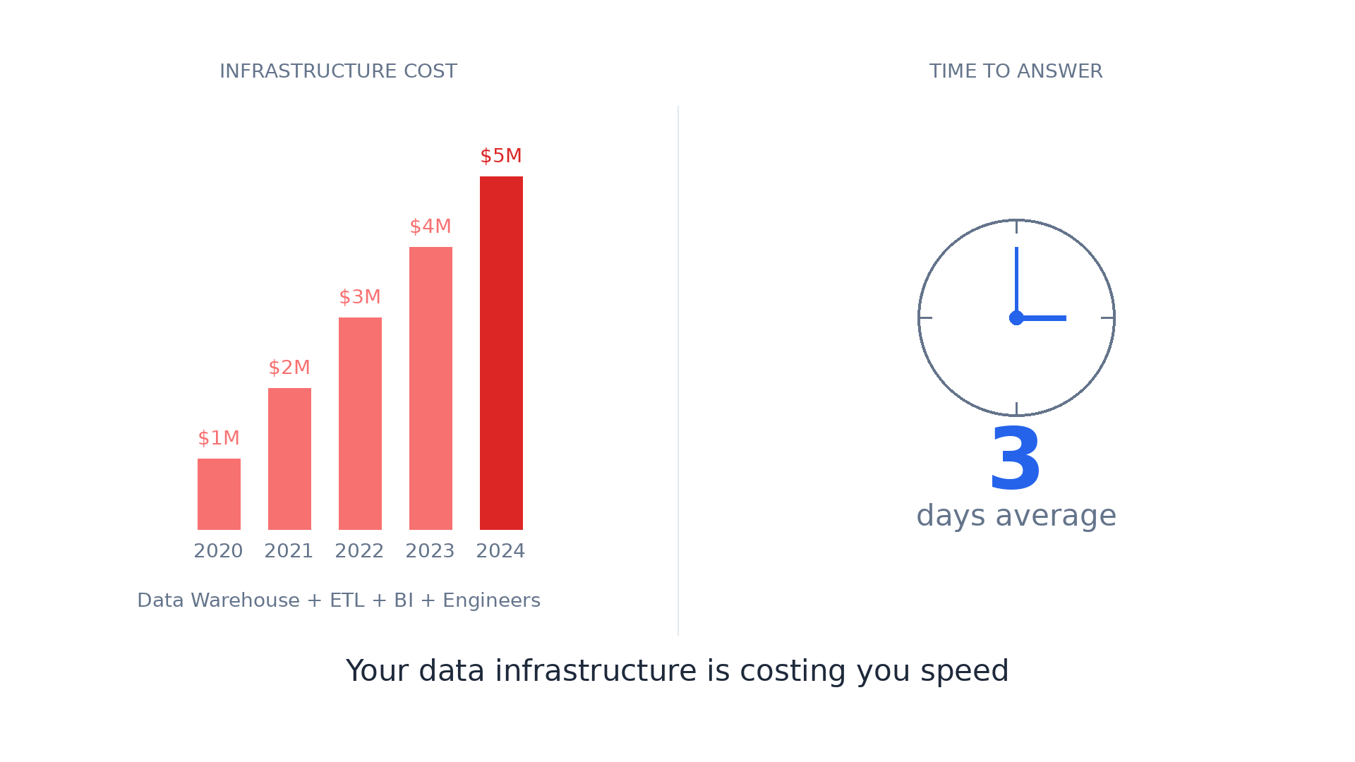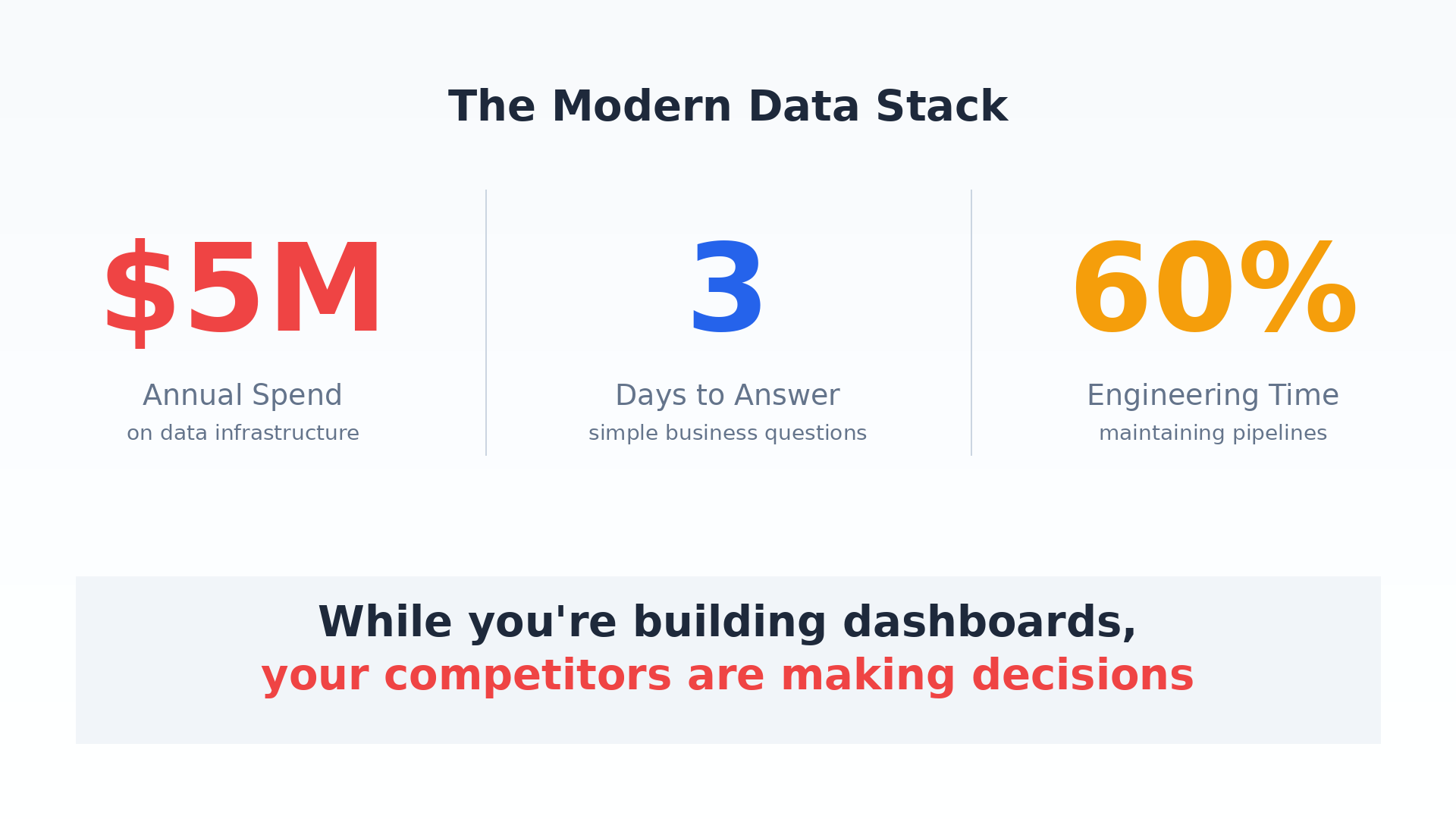 For the CEO: "You're spending $5M/year on data infrastructure. Your team takes 3 days to answer a simple business question. By the time you get the answer, the market has moved. Your competitors with worse data are moving faster than you."