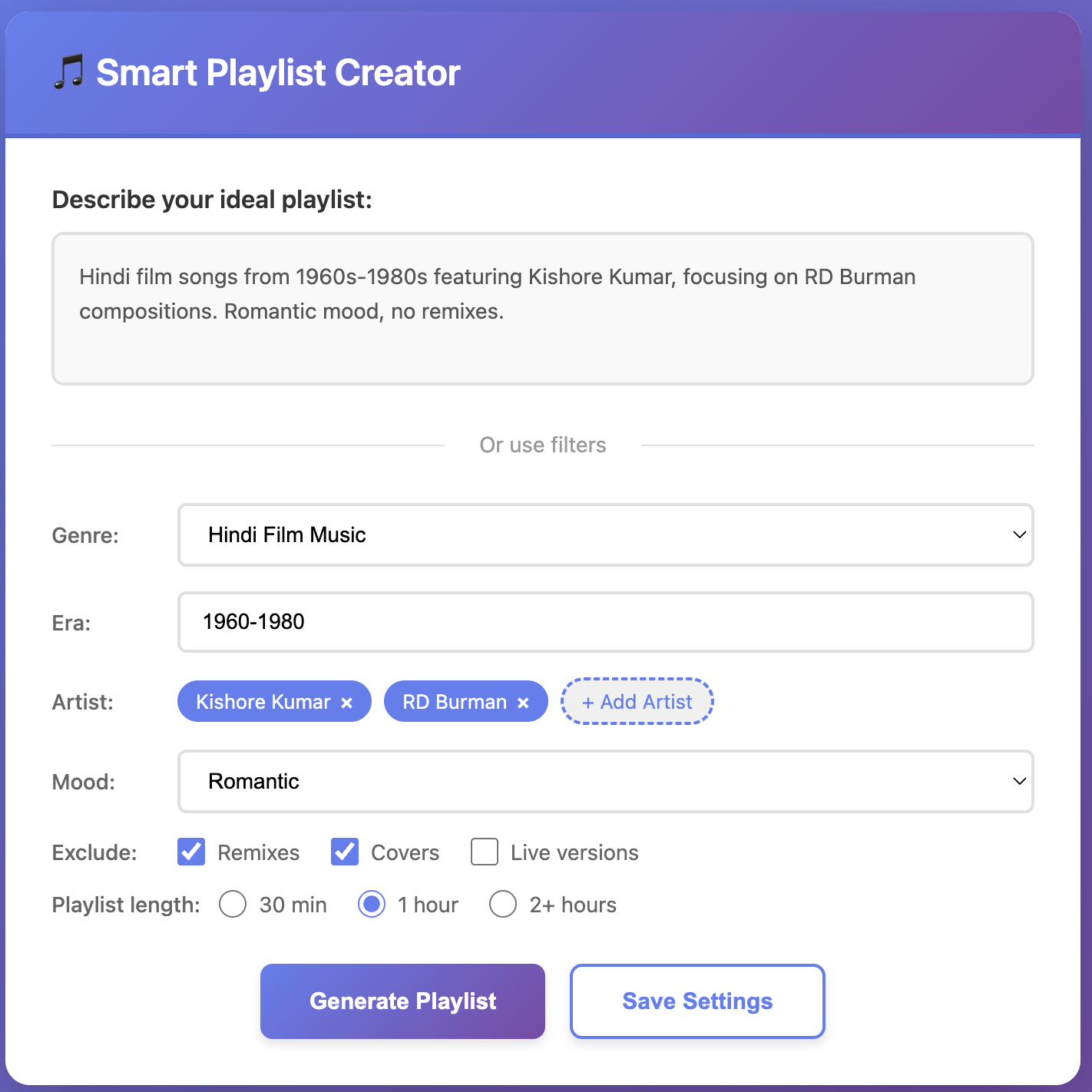 Picture this: You want a simple playlist of songs from your favorite era—let's say Hindi film classics from the Rajesh Khanna and RD Burman golden age. Something any music lover should be able to do in minutes.
